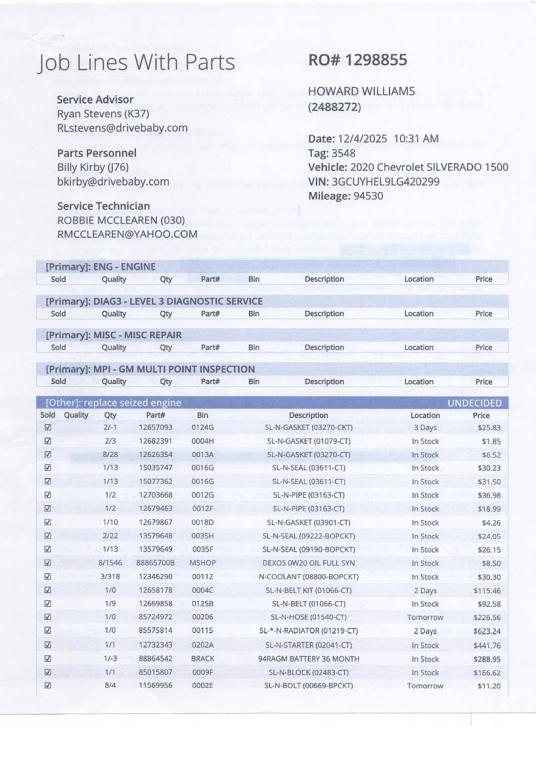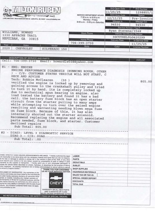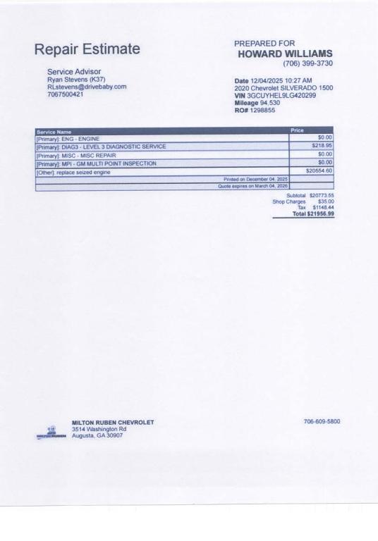 I own a 2005 Chevy Silverado leave had this kind of problems with it. This is why choice to stay the course with GMC vehicle. This problem with my 2020 Chevrolet is a game changer and a setback for me. GMC engines should be manufactured within the United States and Canada. In my lifetime I have own four Chevrolets manufactured in the US and Canada and none of them had the problems of today's GMC vehicles. The making of equipment and vehicles has a higher standard of engineering when produce in the United States and Canada. Most of the new vehicles are manufactured in a foreign country. I am joining this lawsuit to have my 2020 Chevrolet engine repaired or replaced at no cost to me and maybe convince GMC to weigh the odds of returning back home.