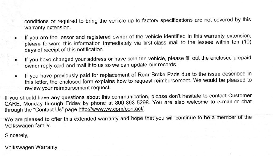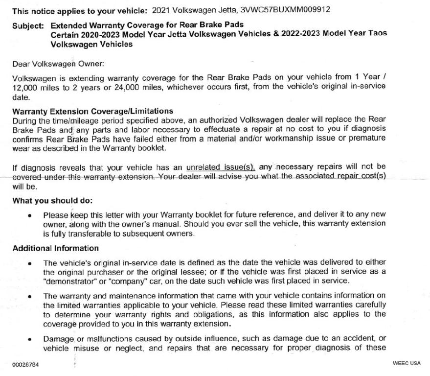 I took my 1 year old Jetta to the mechanic for yearly required inspection and was told the rear brakes were down to 0.2. The car barely passed the inspection. Took the car to the dealer, and it was confirmed the rear brake pads had to be replaced - on a one year old vehicle with only about 24K miles on it! Evidently, VW was aware of this major issue as the mechanic at the dealer told me they found that VW extended the warranty on rear brake pads to 2 years/ 24,000 miles. My car barely qualified at the time so they were replaced at no charge. The quoted cost was $733 at the time. I got a letter in the mail about the extended warranty after rear brake pads had already been replaced. The car is currently at 56K miles, and the rear brake pads have been holding up, but I'm still a bit nervous. Beware.